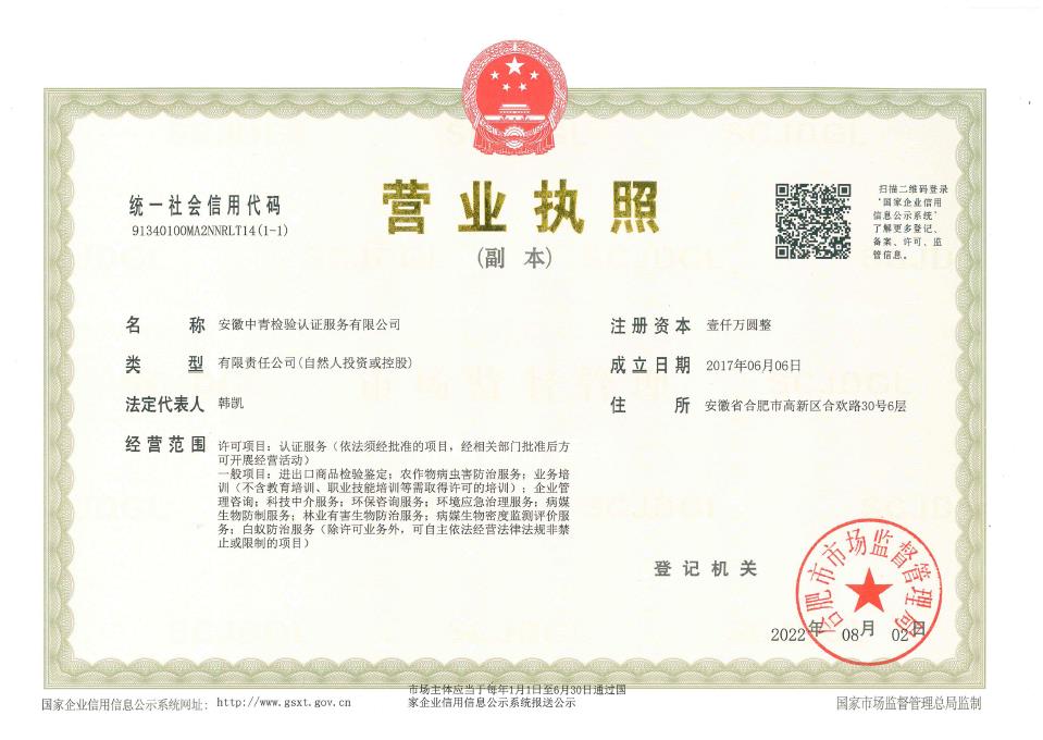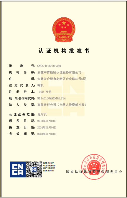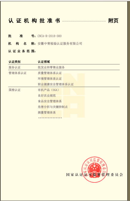 安徽中青檢驗認證服務(wù)有限公司成立于2017年6月6日,2018年1月3日通過國家認證認可監(jiān)督管理委員會批準,現(xiàn)認證領(lǐng)域:質(zhì)量管理體系、環(huán)境管理體系、職業(yè)健康安全管理體系、食品安全管理體系、HACCP管理體系、有機產(chǎn)品認證、良好農(nóng)業(yè)規(guī)范、服務(wù)體系、醫(yī)療器械質(zhì)量管理體系、企業(yè)誠信管理體系、食品工業(yè)企業(yè)誠信管理體系、食安安徽品牌等類別認證。